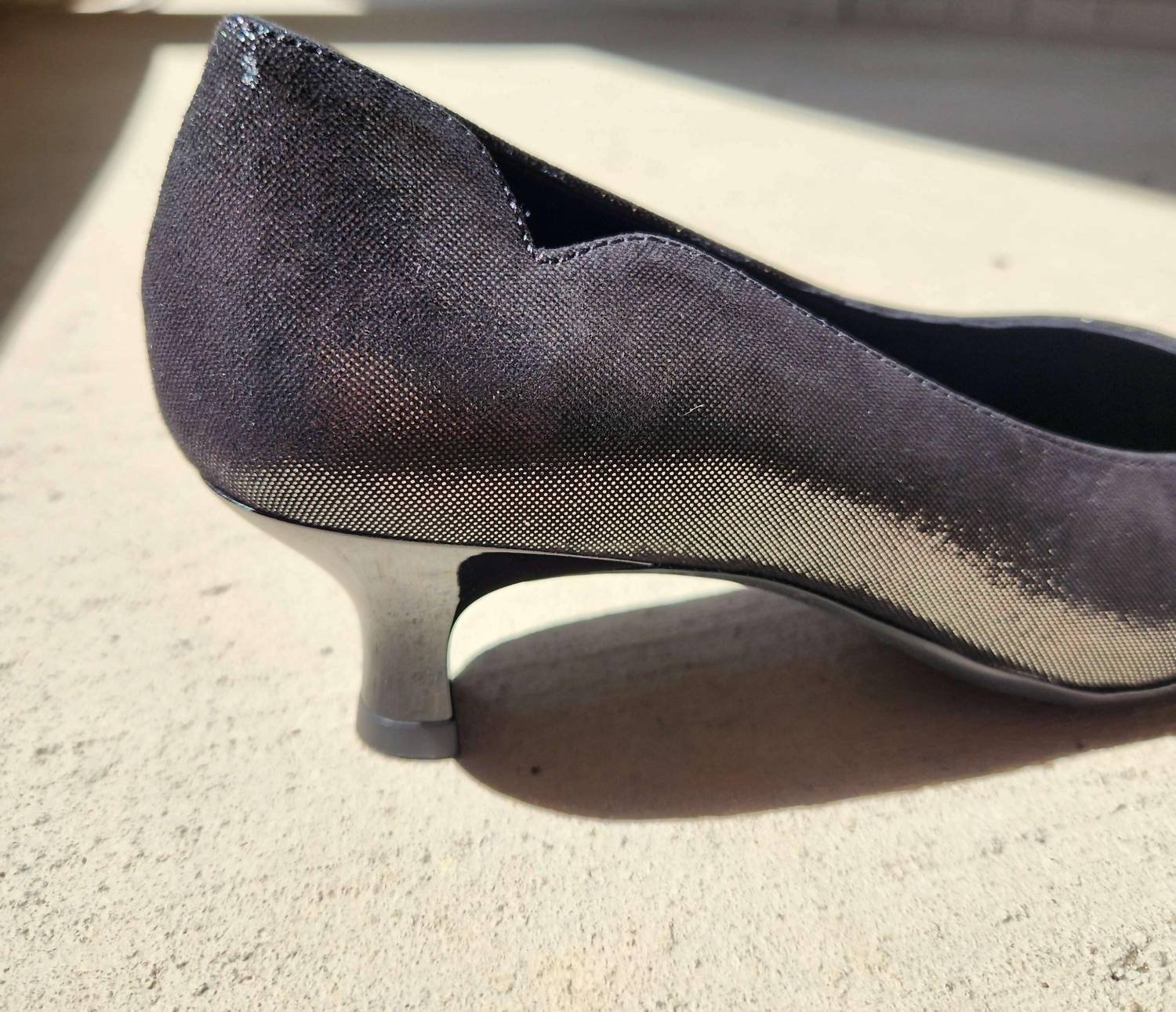 Don’t be deceived, these heels are comfy as can be.Step into elegance with Women’s Kat Heels by Ara, featuring a charming 1.5′ kitten heel in a sophisticated black metallic print. This heel boasts an almond toe and an asymmetrical vamp, perfect for enhancing your workwear or adding a touch of glam to a dinner party. Enjoy all-day comfort with Ara’s signature HiSoft padded arch support. For those with narrow feet, consider a fit pack for a snug fit.