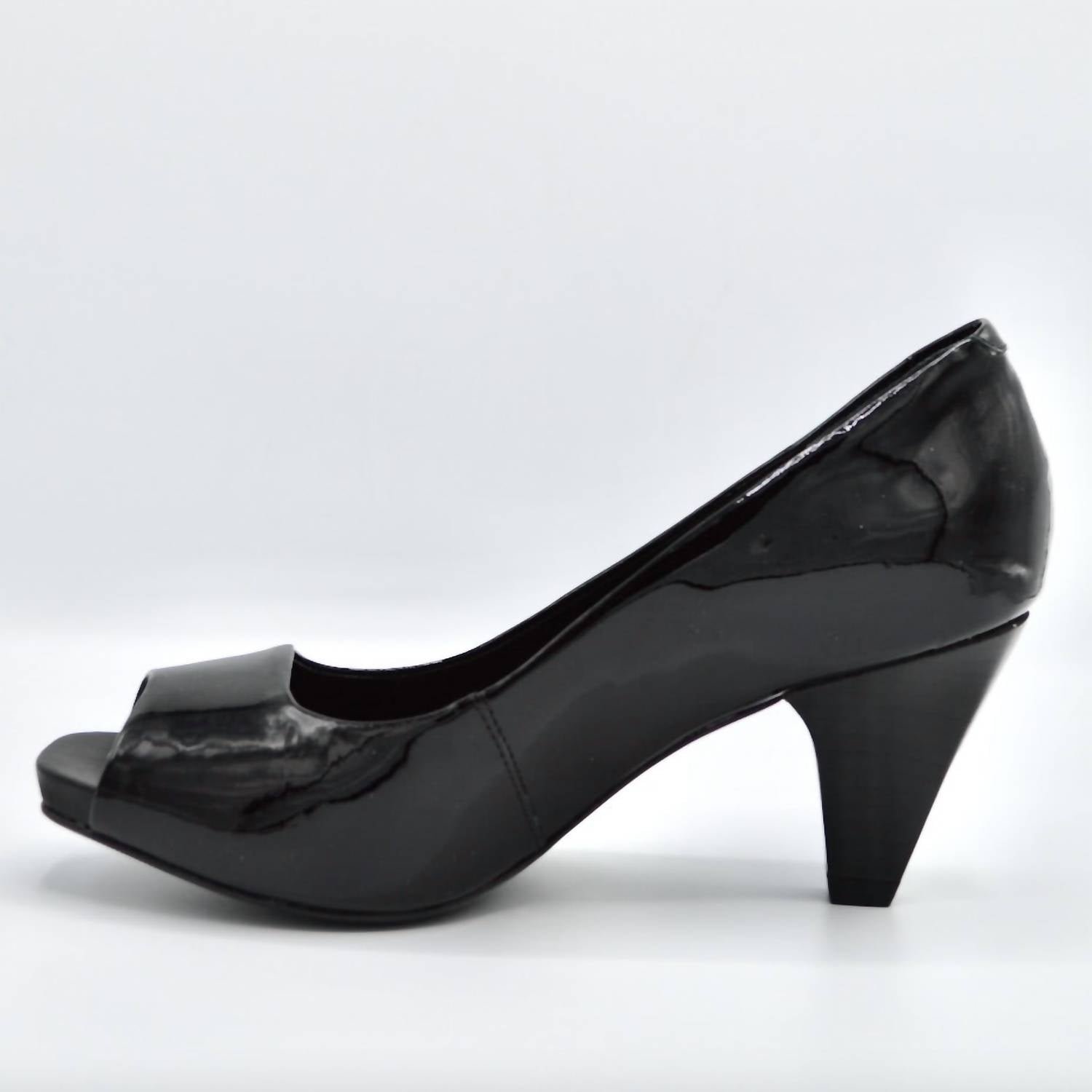 Pair these beauties with your favorite skinny jeans or dress for a night out on the town.Elevate your style with the Women’s Swing Mid Heels by Chelsea Jones, crafted in sophisticated black patent leather. Featuring a timeless peep-toe design with a convenient adjustable sling-back closure and a comfortable closed back, these heels are perfect for any engagement or summer occasion. The cone heel stands at a comfortable 2.5 inches, complemented by a 1/2 inch flexible gel-filled footbed for lasting wear. Made in Brazil with a luxurious leather upper and lining, and finished with a traction rubber sole for stability.