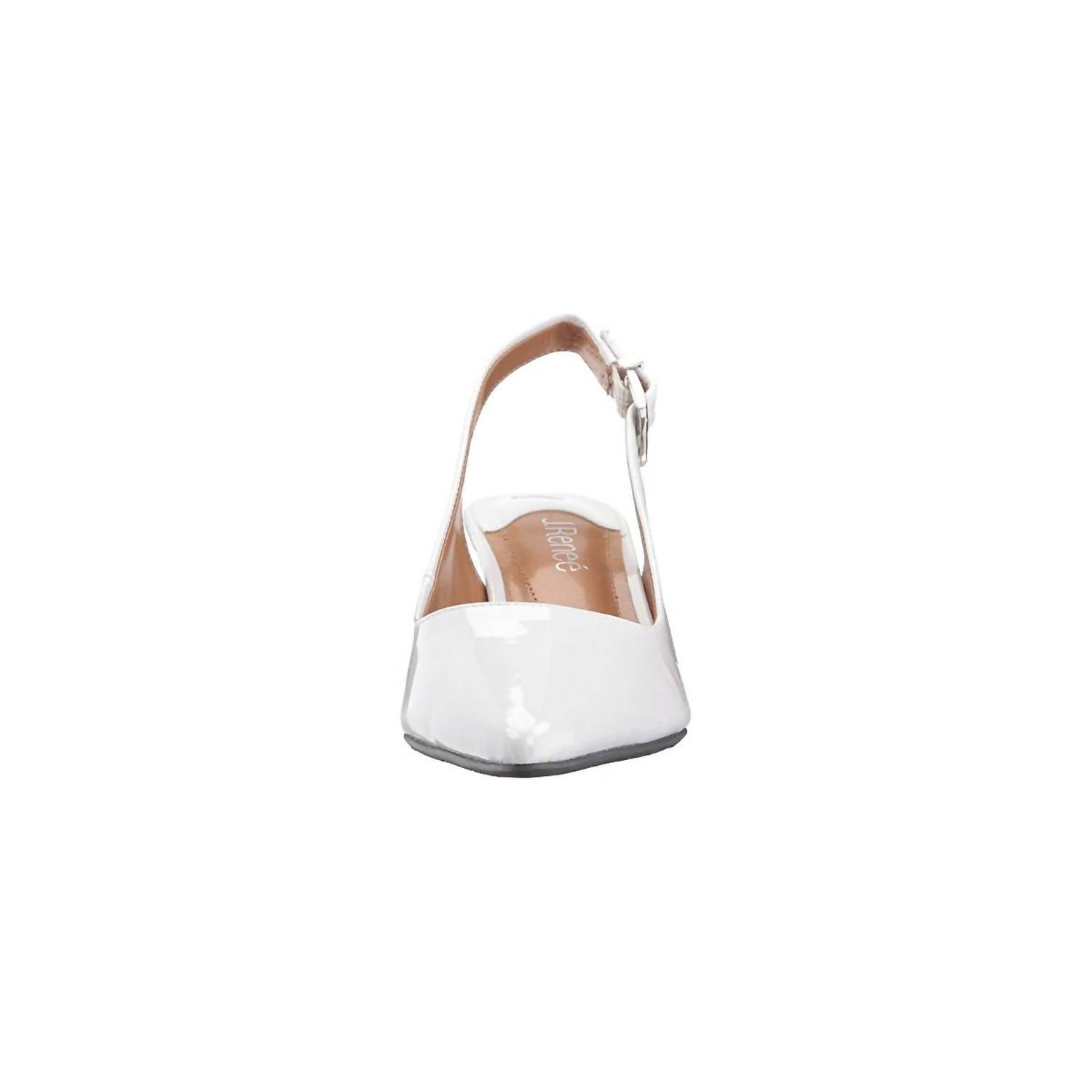 Pair these beauties with your favorite skinny jeans or dress for a night out on the town.Step into elegance with the Women’s Mayetta Pump by J. Renee, crafted in chic White Pearl faux-patent leather. Designed with a pointed toe, this sophisticated heel features a slingback strap and an adjustable buckle closure for a tailored fit. Comfort is paramount with smooth synthetic linings and a memory foam footbed providing added padding at key points. The modest 2-inch sculpted cone heel offers a stylish finish, supported by a durable man-made outsole.