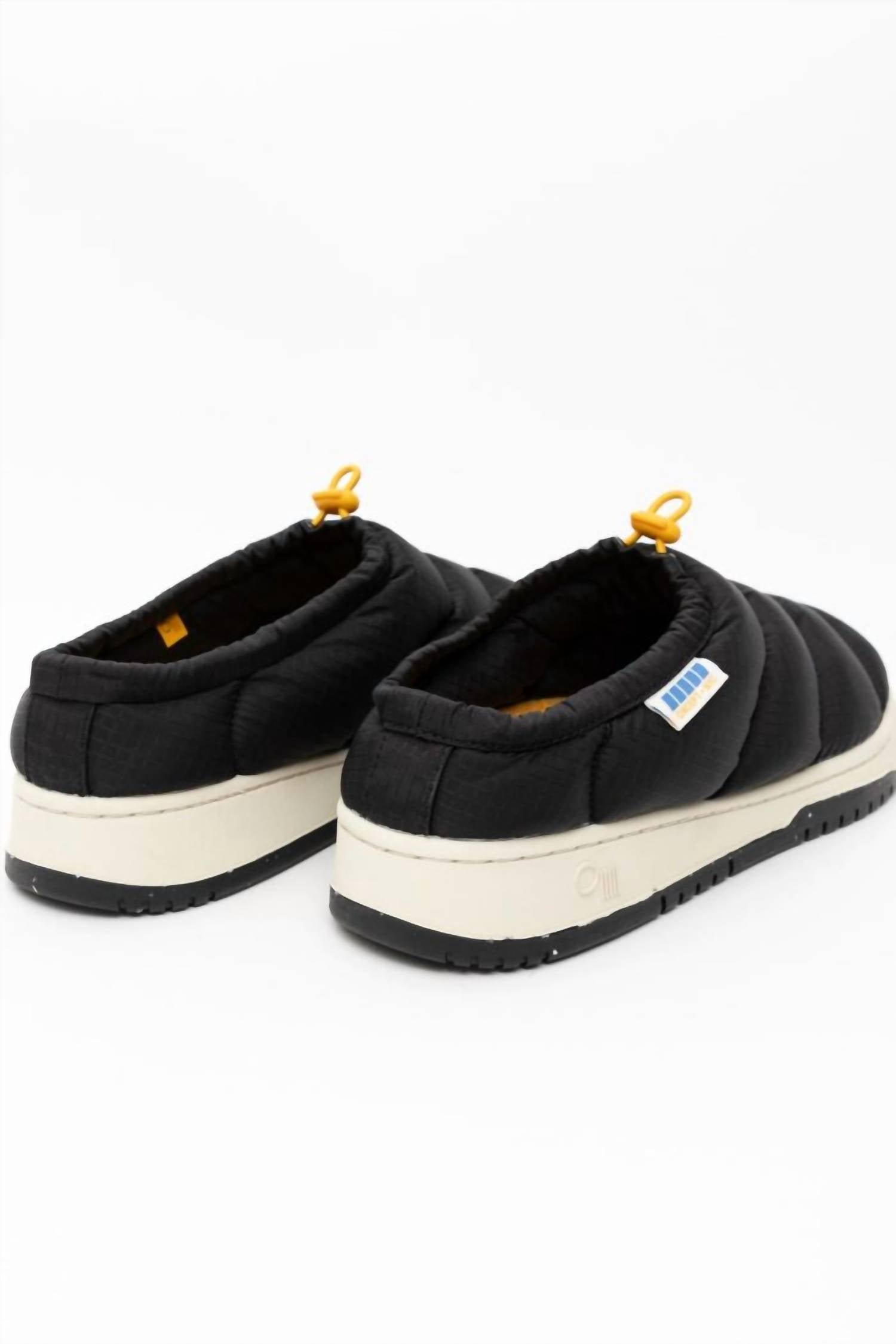 A trend that everyone is loving and this style might just be our favorite.This sleek black mule is made from ultra-soft, water-resistant recycled nylon and supple suede. Designed for comfort and sustainability, it features plush organic cotton filling and easy slip-on construction. With a durable two-ton molded bottom and recycled insole boards, it includes re-plastic toggles and elastic cording for a secure fit. Perfect for everyday wear, it combines functionality with stylish re-splash ripstop and re-speckled nylon accents.
