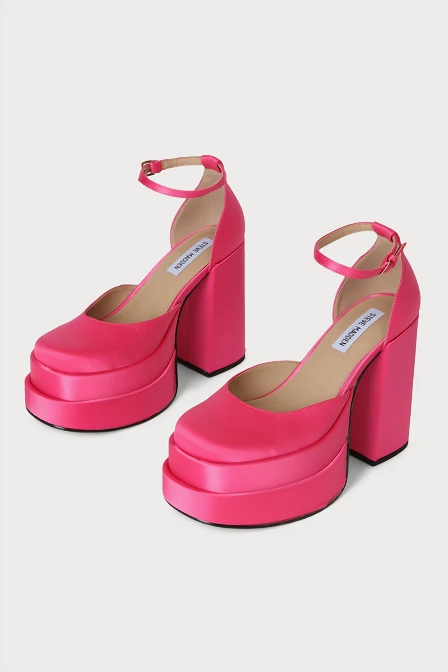 The perfect height for day to night.Features a rounded-toe upper with a low-cut collar and an adjustable ankle strap with a gold buckle. Textile upper material. Vegan leather lining. Synthetic sole. 5 inch heel height. 2 inch platform.