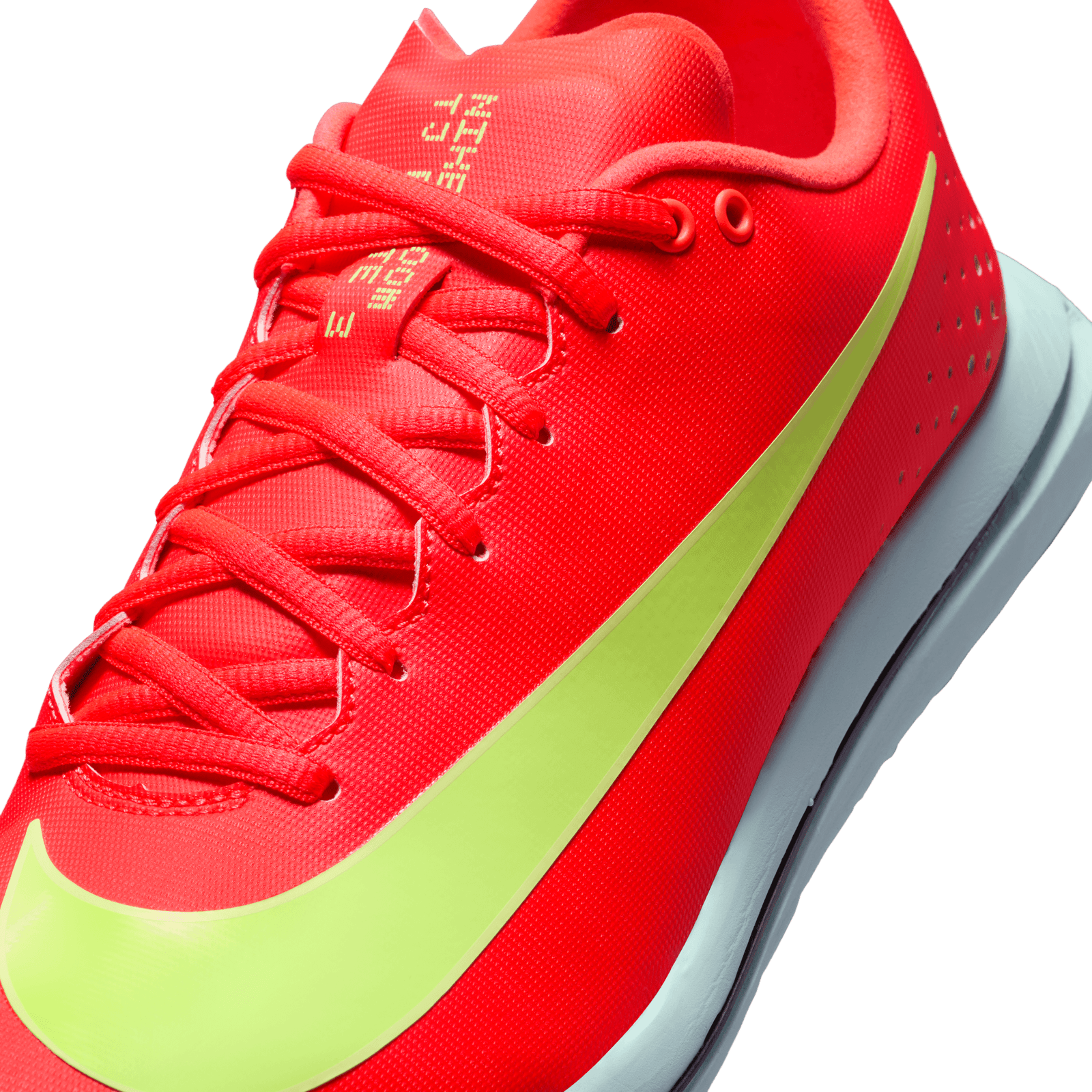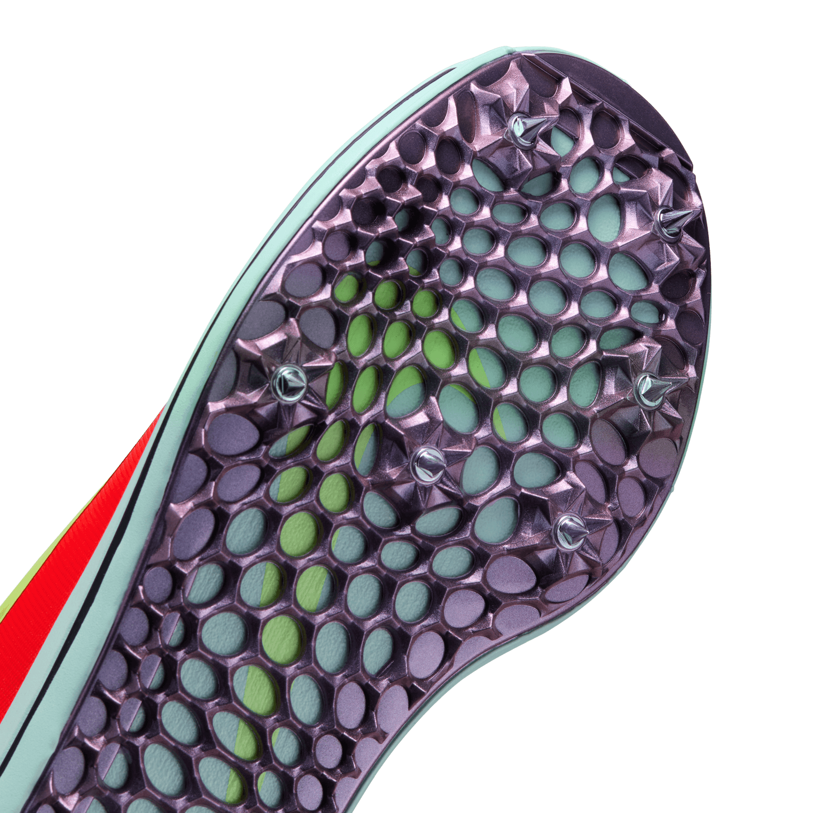 Generative outsole has six spikes for lightweight and durable traction.