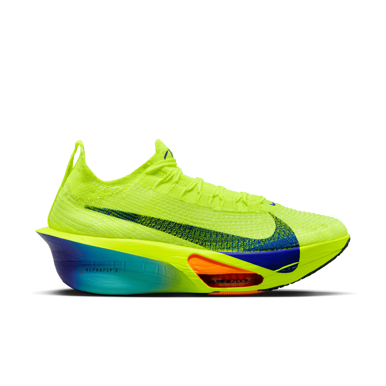 Fine-tuned for marathon speed, the Alphafly 3 helps push you beyond what you thought possible. Three innovative technologies power your run: A double dose of Air Zoom units helps launch you into your next step; a full-length carbon fiber plate helps propel you forward with ease; and a heel-to-toe ZoomX foam midsole helps keep you fresh from start to 26.2. Time to leave your old personal records in the dust.